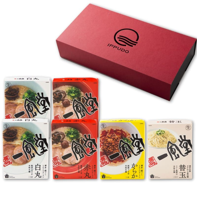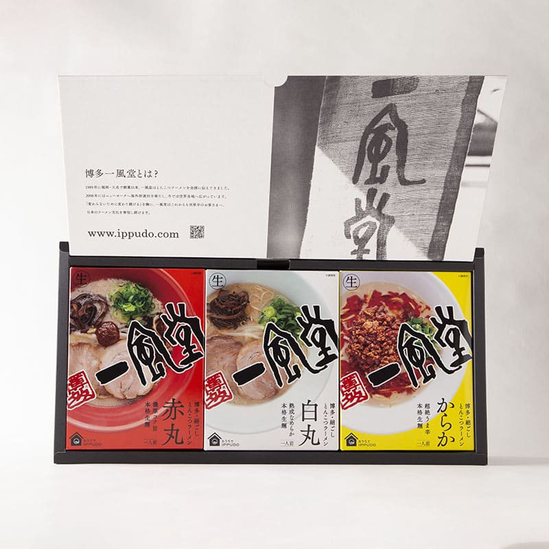 イメージカラーの赤を基調としたオリジナルギフトボックスに一風堂を代表する人気のラーメン「白丸」「赤丸」「からか」を詰合せました。 スタイリッシュなデザインが目を引く、ラーメン好きに喜ばれるギフトです。